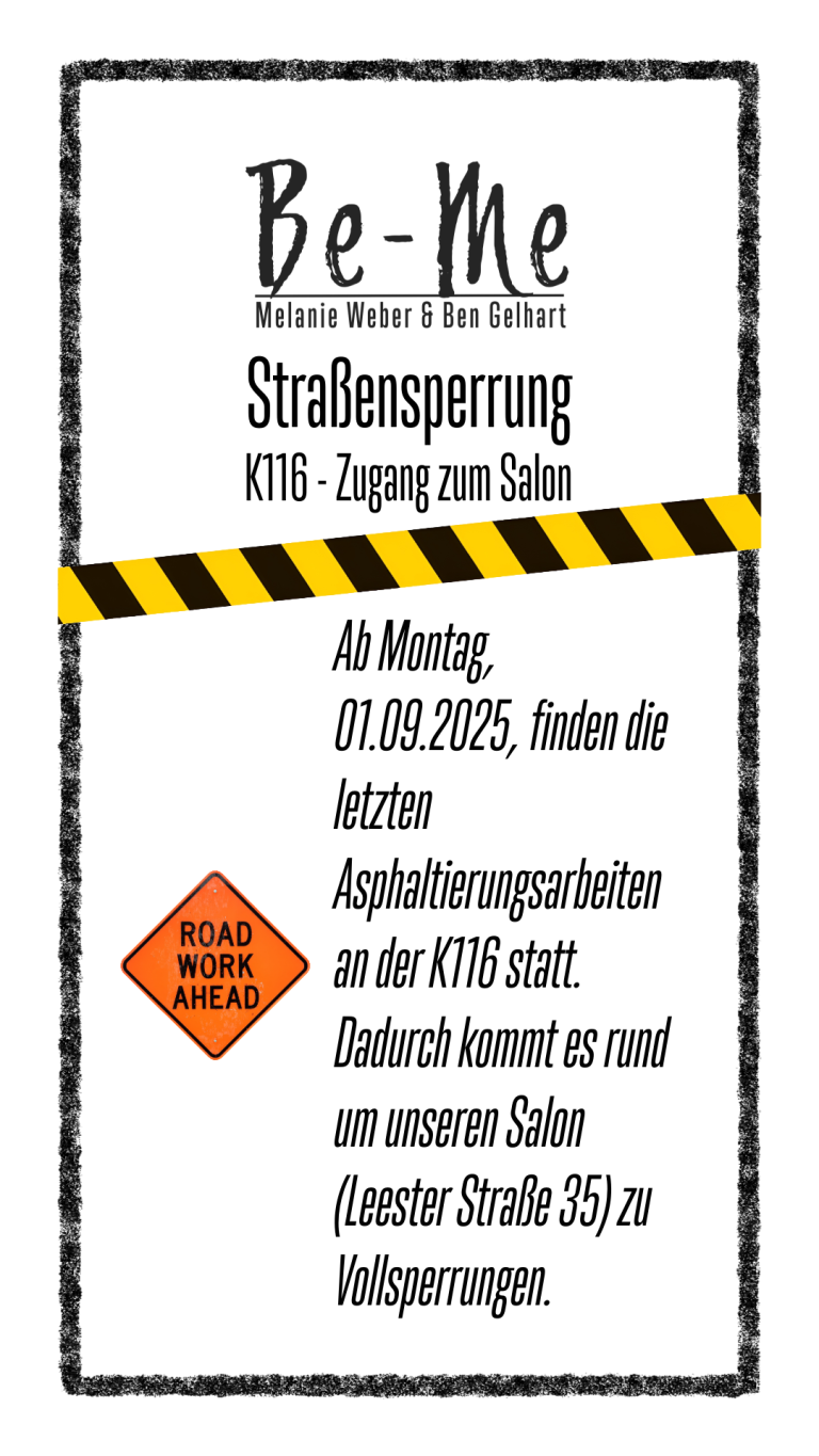 nun ist es soweit, die Bauarbeiten an der K116/Leester Str. haben begonnen. Leider sind auch wir davon betroffen. Die Anfahrt zum Salon ist massiv gestört. Für alle Kunden, die gut zu Fuß sind, empfehlen wir das Parken bei der Kirche/Henry-Wetjen-Platz. Alle anderen müssen auf die Seitenstraßen ausweichen und dennoch einen kleinen Fußweg einplanen. Wann diese Störung behoben sein wird, ist wie immer bei so ein Vorhaben nicht absehbar. Die Sperrung betrifft die Leester Str. Richtung B6. Von der B6 kommend sollen, laut Bauunternehmen, Zufahrten möglich sein. Plant bitte für die Anreise mehr Zeit ein.